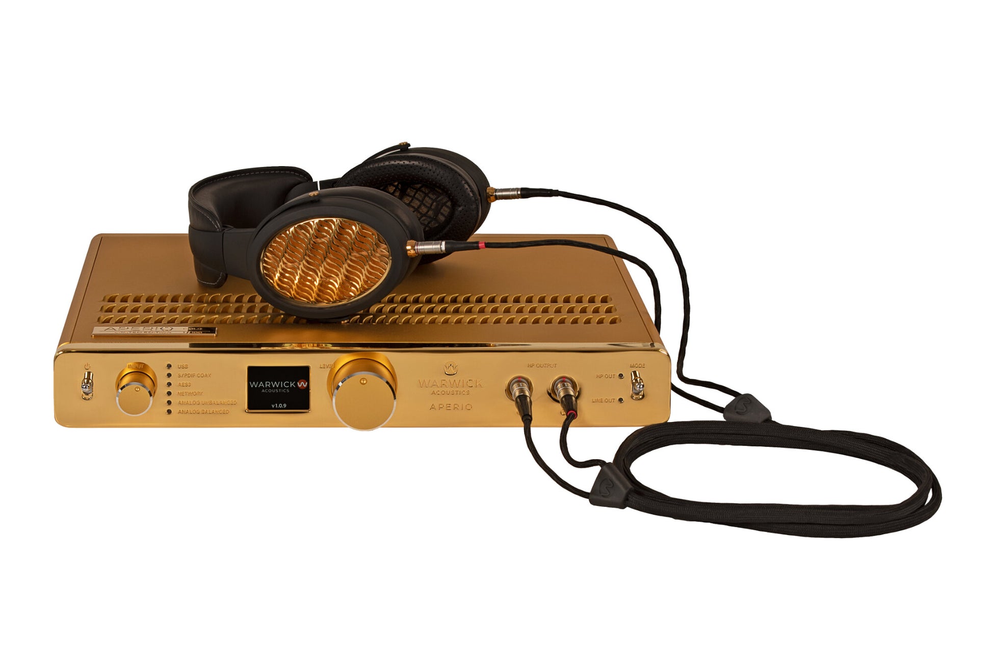 The headphone grilles, hardware, and Amplifier front panel have all been custom hand-finished in 99.9999% pure 24 Karat Gold. Each Gold APERIO also bears a unique individually numbered ‘Limited Edition’ nameplate that sits on top of the Amplifier.